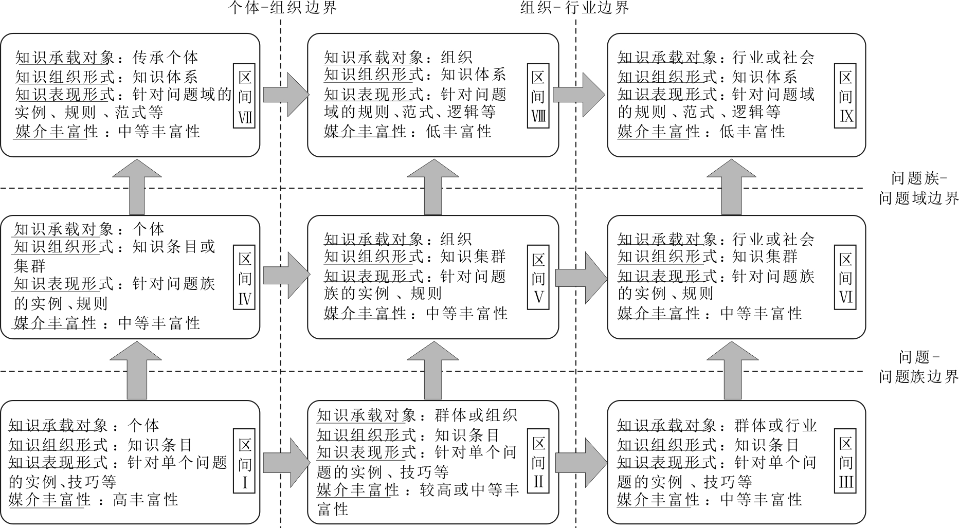 在知识演变体系模型的不同区间之间,知识承载对象、组织形式、表现形式及知识的媒介丰富性等关键特征均有所不同,如图4所示。
