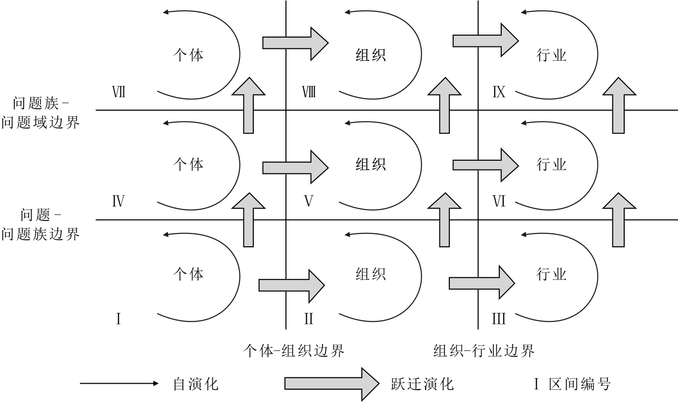 (6)区间Ⅵ。区间Ⅵ的内容为超出企业范围的行业或社区力量在同一技术条件下解决同类或相似问题,并在该过程中的知识体系演变及知识积累过程。这是目前较为普遍的一种知识演变现象和知识积累形态。在跨组织或跨部门利用大规模协同平台合作完成创新性产品研发和决策辅助过程中,经验性隐性知识逐步产生、积累、成熟。这些经验知识及其发展演变过程能够指导企业作出恰当的决策,有助于问题得到快速、有效的解决。