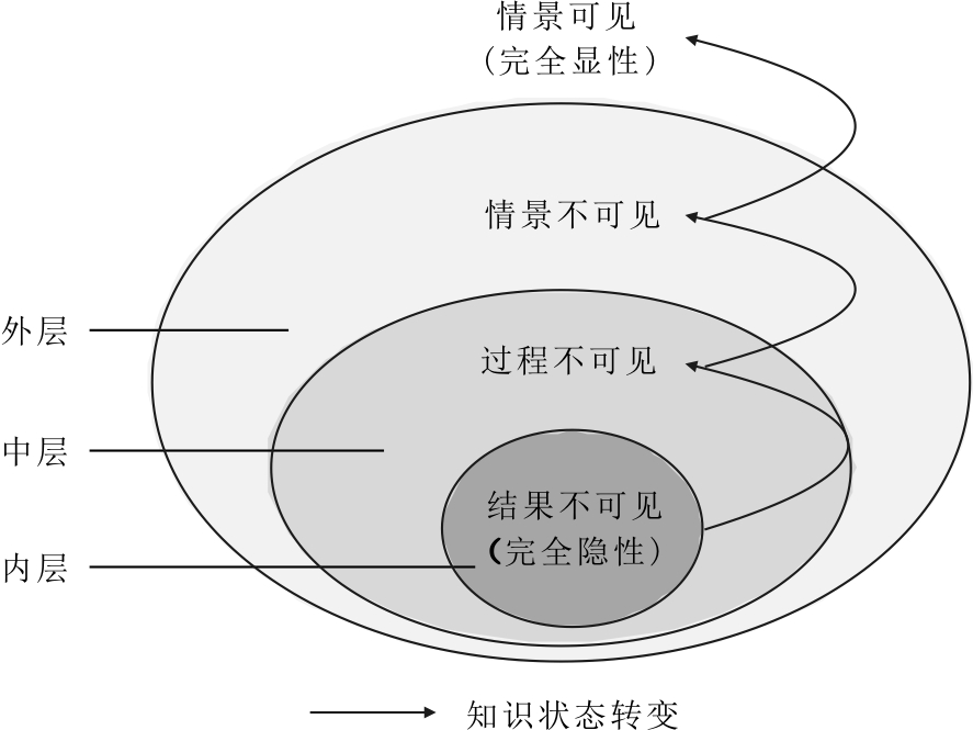 知识的“隐性”被分为嵌套结构的3级阶层,内层为结果不可见,这是隐性知识的经典含义和广泛采用的形式。中层过程不可见和外层情景不可见为本文提出的新概念,是对知识显性/隐性二分法的创新与拓展,详述如下: