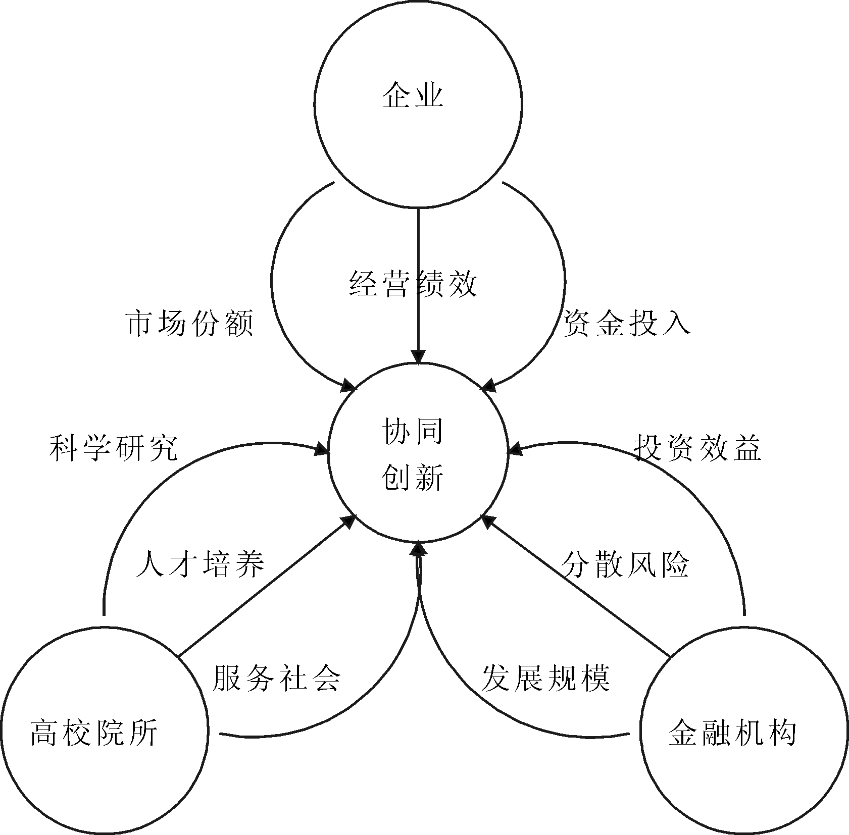 (1)企业。随着市场经济不断发展,企业生存与发展对科技支撑的依赖日益加剧。一方面,企业在产学研金协同创新活动中通过获得以市场为导向的新技术、新成果提高企业市场份额。企业作为自主经营、自负盈亏的经济实体,在竞争激烈的市场环境中只有不断提高自身技术水平,才能保证拥有足够的实力在竞争中占据有利地位;另一方面,企业需要与高校及科研院所合作提高经营绩效。企业与高校及科研院所的优势资源具有异质性,而合作可以实现优势互补,形成规模效益,降低交易成本。另外,企业技术创新和成果转化活动需要大量资金。