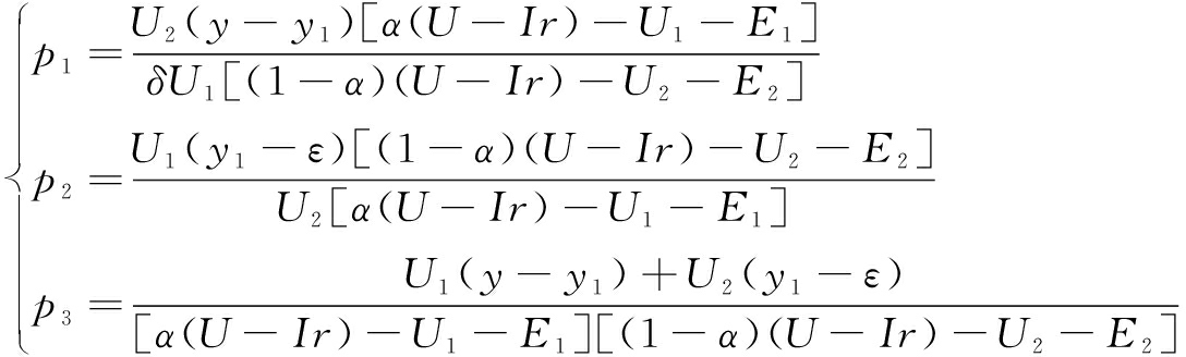 (2)高校及科研院所进行协同创新的概率与U1成正比,与U2成反比,说明高校及科研院所在选择协同创新对象时,希望对方有较强的创新能力,但当自身创新能力足够强时,协同创新意愿就会下降。当y1-ε为正时p2>0,并且y1-ε越大,p2值就越大,说明当企业信誉较好、还款能力较强时,高校及科研院所越愿意进行协同创新。(1-α)(U-Ir)-U2-E2代表高校及科研院所协同创新的收益与独自创新收益和搭便车收益之差,当(1-α)(U-Ir)>U2+E2时,高校及科研院所才会选择协同创新,高校及科研院所进行协同创新获得的利益越大,进行协同创新的概率就越大。