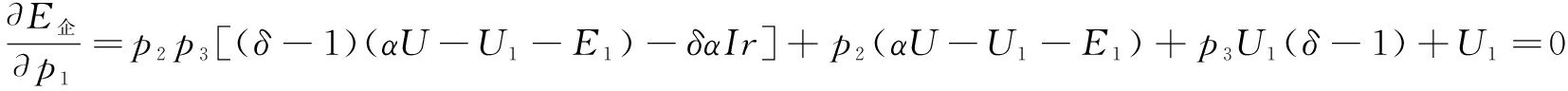 企业的期望收益为:E企=p1p2p3[(δ-1)(αU-U1-E1)-δαIr]+p1p2(αU-U1-E1)+p1p3U1(δ-1)+p1U1+p2E1+R1