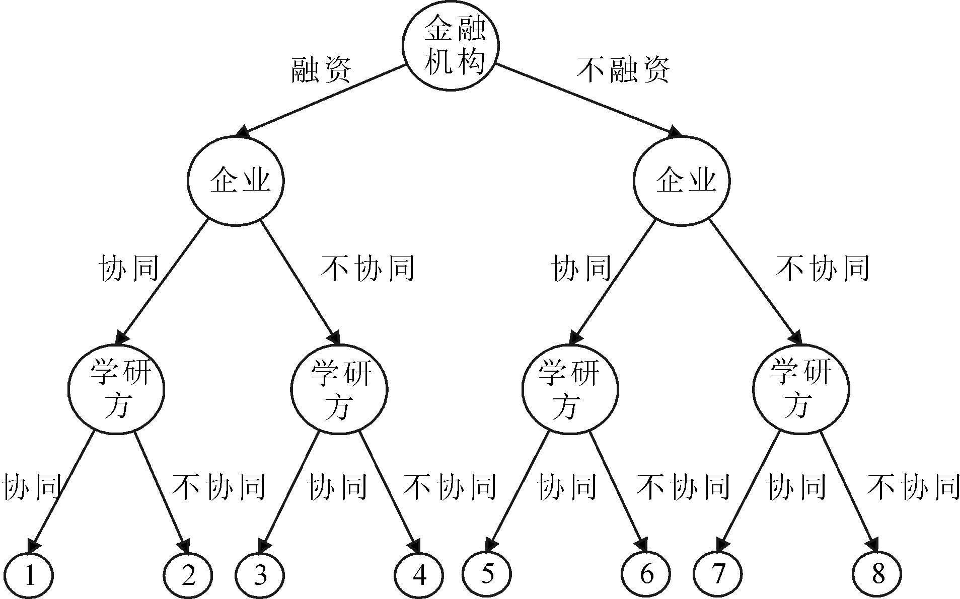 基于以上假设,本文采用完全信息动态博弈模型对产学研金协同创新体系中产、高校及科研院所和金融机构的动态博弈过程进行分析,具体动态博弈模型设定如下:
