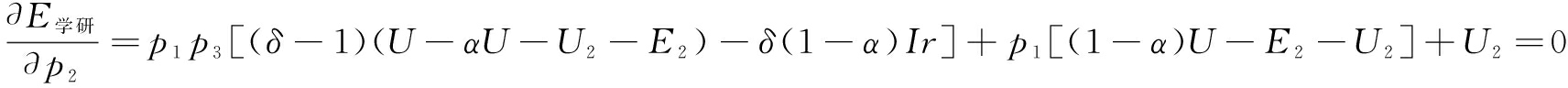 高校及科研院所的期望收益为:E学研=p1p2p3[(δ-1)(U-αU-U2-E)-δ(1-α)Ir]+p1p2[(1-α)U-E2-U2]+p1p3E2(δ-1)+p1U2+p1E2+R2