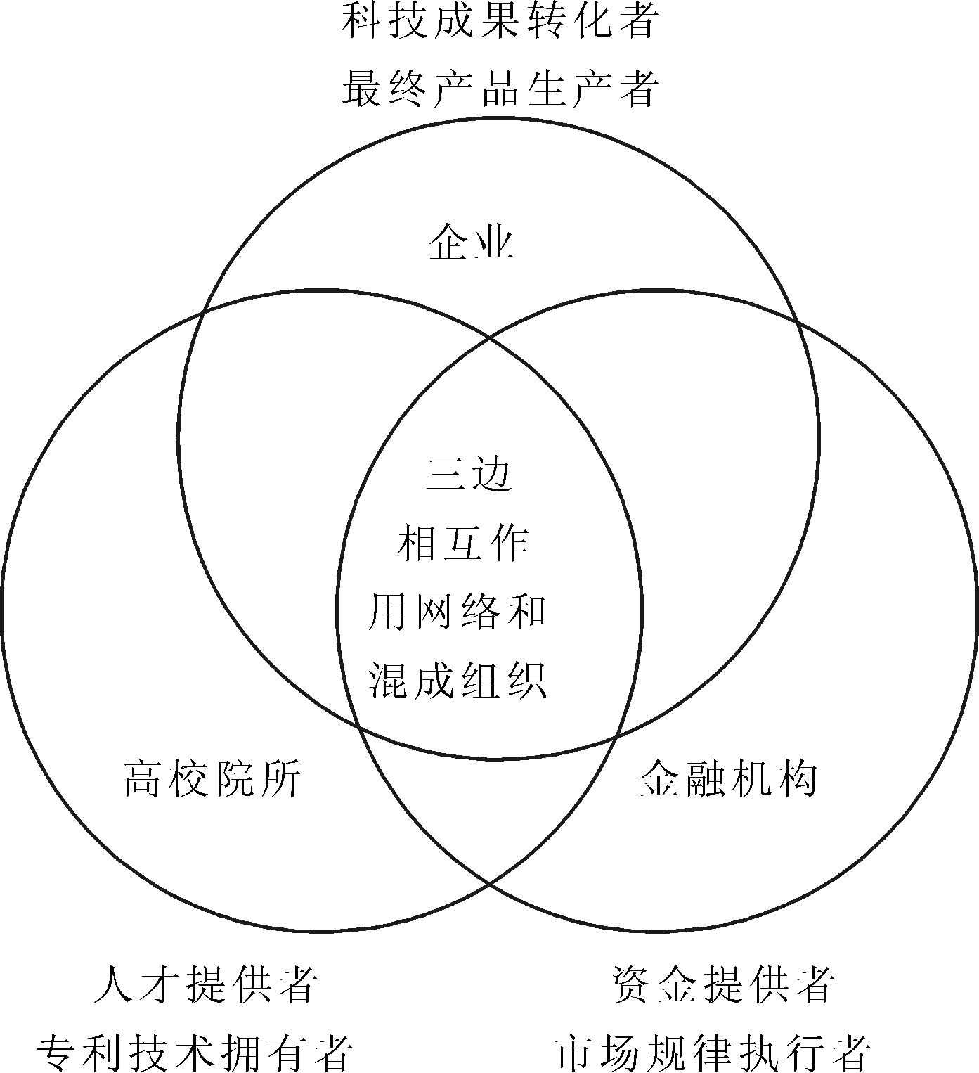 本文根据三螺旋模型理论,建立由企业、高校及科研院所和金融机构三方构成的产学研金协同创新三螺旋模型,即企业、高校及科研院所和金融机构在创新过程中密切合作、相互作用,形成3种力量交叉影响、螺旋上升的三螺旋关系。在三螺旋模型中,企业是技术成果应用者和产品生产者,高校及科研院所是技术成果提供者,金融机构是资金提供者。企业、高校及科研院所和金融机构在合作中相互交叠、渗透,每一个主体除执行原有角色的职能外,还表现出其它主体的一些特征,如图1所示。
