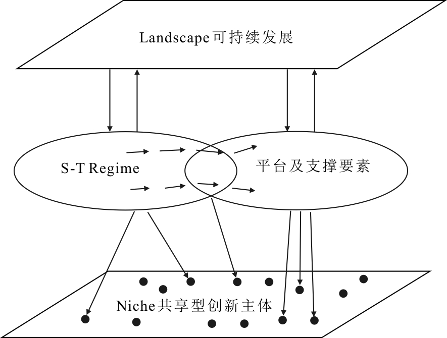 社会技术域(S-T Regime)由处于中观层面的社会系统和技术系统构成,包括政策、生产消费、社会价值和文化等社会层面,以及信息、科技等技术层面的主导要素构成。主要职能包含两个方面:①传递小生境的创新能量,促进自身场域内变革;②通过技术革新与政策升级,为小生境创新群落提供适宜的技术支撑和政策环境,从而推动整体创新。社会技术域的3个主要特征:①共享平台是主要技术载体,共享型创新群落驱动可规制共享平台搭建;②价值网系统重构、价值主张、价值诉求以及价值实现均与传统相区别;③政策规制变革需求迫切,亟需适宜的政策变革,扶持并培育小生境创新群落成长,从而形成指数级增长的网络价值与规模。
