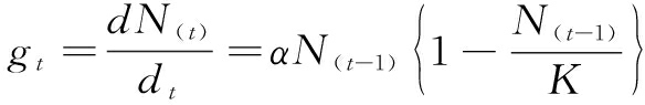 gt表示第t期种群增长率,Nt表示第t期种群个体数量。Nt/K表示第t期种群占用创新系统内的资源量,创新种群中每个单位占用资源为1/K。