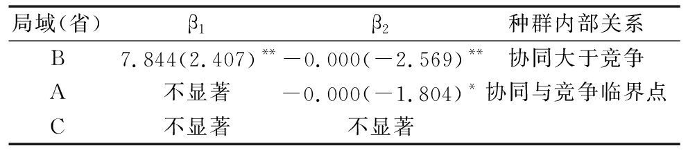 由表2发现,A局域内共享型企业与B局域内的相互协同作用显著。C局域内的企业种群与A、B局域内的企业种群均处于相互关系不显著状态,协同或竞争关系均不显著,某些局域内的种群特征不显著,可能是由于种群存在跨局域分布现象所致。