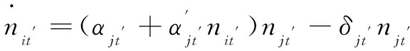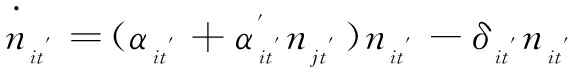 其中N1(t)、N2(t)为相邻局域同种创新种群在t时期的个体数量。β12为种群2对种群1的影响系数,β21为种群1对种群2的影响系数。