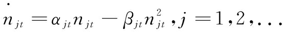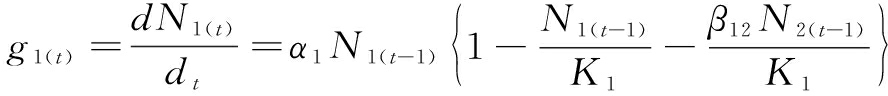 △N(t)为t期种群个体数量的变化量。β1=α,通常β1>0,表示种群内部协同效应。β2=-α/K, 通常β2<0,表示种群内部竞争效应,称为内部竞争系数或种群密度抑制系数。