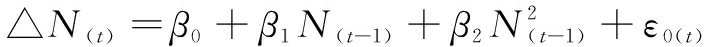 式(9)变形为: △N(t)={β1+β2N(t-1)}N(t-1)