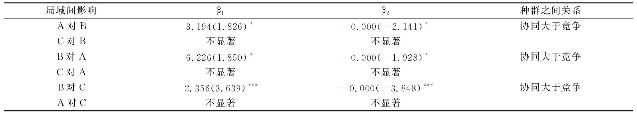 表1结果说明,B局域内共享型服务创新种群内部关系表现为协同效应。A局域内服务企业的协同效应不显著,可以通过竞争系数值判断为内部竞争关系,由于β2值很小,可判定为处于协同与竞争的临界点处。C局域内共享型企业的协同效应系数与内部竞争系数均不显著,局域内种群内部关系不是影响种群演进的主要原因。C局域内共享型企业的生产运营行为具有比较显著的外部性。该局域内企业生产经营不仅与本地环境发生互动作用,更多地表现为更大区域内的互动关系。因此,局域内种群内部关系不显著。相邻局域种群之间的关系计量结果见表2。