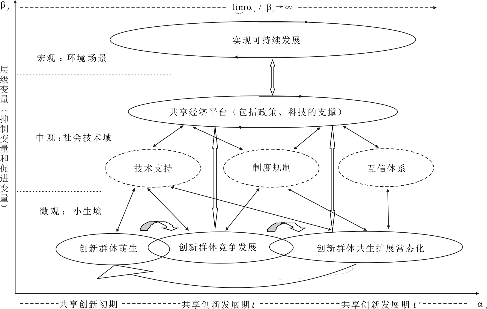 因此,3个层级之间存在相互作用、动态演进的过程。小生境中的共享创新群落作为新经济形态,可以影响中观要素层面,成为突破宏观环境场景下可持续发展压力的主要动力来源。共享创新主体对资源整合及再分配功能,可以实现环境保护和资源永续利用。共享经济强调被忽略的过剩产能与资产优化配置及再利用,成为传统产业创新的动力来源。