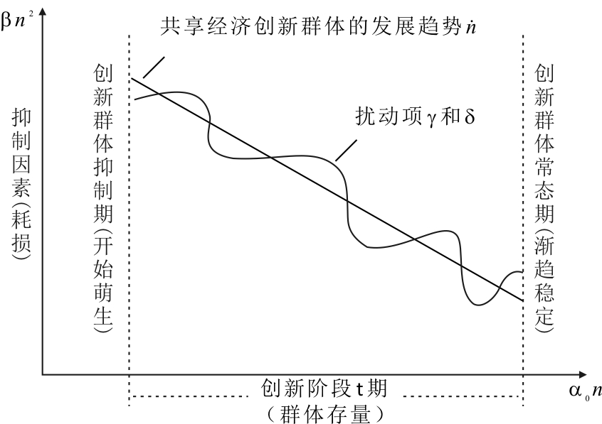 a0n为创新小群体存在状态,-βn2则是以由创新群体生存所须的资本和资源消耗引入,这里的耗损包括参与共享群体数量减少以及过剩产能存量、道德危机和信任危机等,如图2所示。