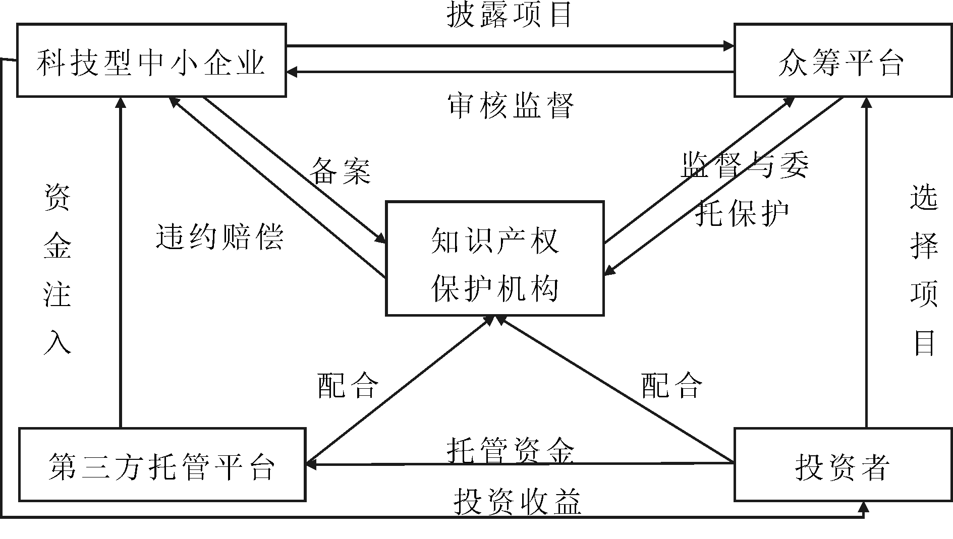 科技型中小企业向知识产权保护机构备案,并定期披露相关进展,众筹平台与知识产权保护机构签订协议,并自觉接受监督。平台对科技型中小企业发起项目进行登记,不再接受以后类似其他项目发起人提供的项目,并且不强制要求科技型中小企业披露核心技术信息。投资者和第三方资金托管平台全力配合知识产权保护机构运行,当平台违约或知识产权受到侵害时,科技型中小企业知识产权利益将得到知识产权保护机构的保护和索赔支持。构建知识产权保护模式有利于健全知识产权保护制度,降低或转移科技型中小企业知识产权被侵害的风险。