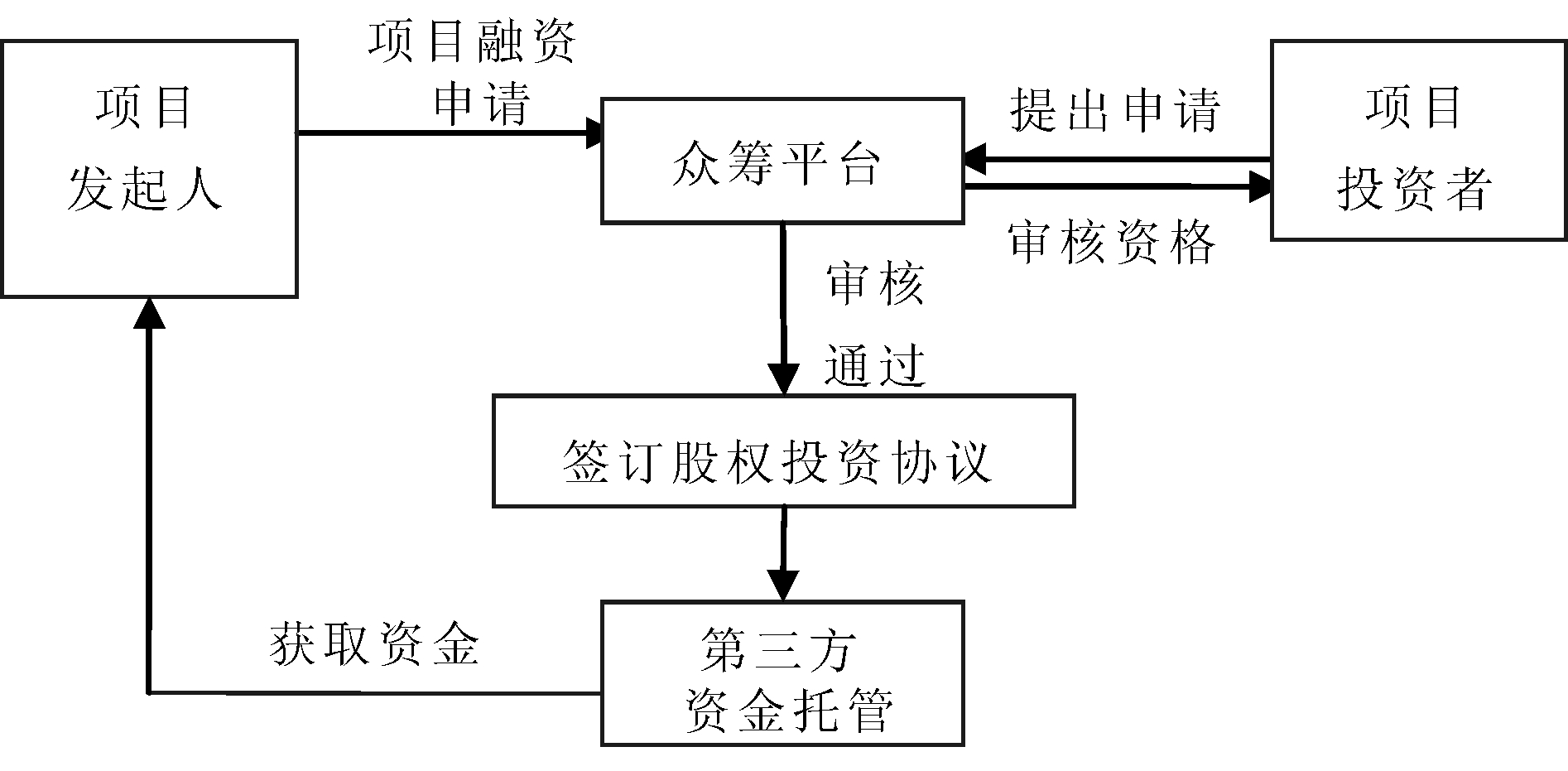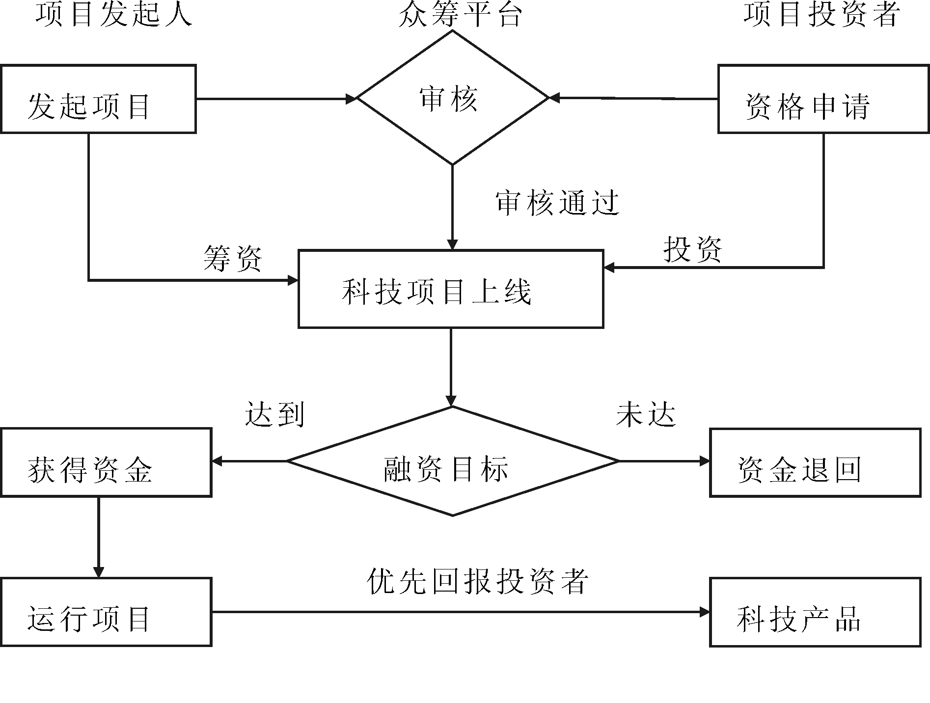 项目发起人首先向众筹平台申请发起科技项目,披露企业相关背景、现状等,众筹平台作为中介机构,负责对申请人和科技项目进行审核及监督。审核通过后,众筹平台展示申请人和科技项目内容,公布融资目标信息,以便于投资者了解评估。项目投资者通过平台了解科技项目相关信息,根据个人喜好或评判作出投资决策,签订项目协议。其中,部分平台指定托管银行或第三方支付作为第三方资金托管平台保管资金,以提高资金透明度和安全性。若融资成功,则发起人获得资金,进一步运营科技项目;若融资失败,则资金全部退还给投资者。