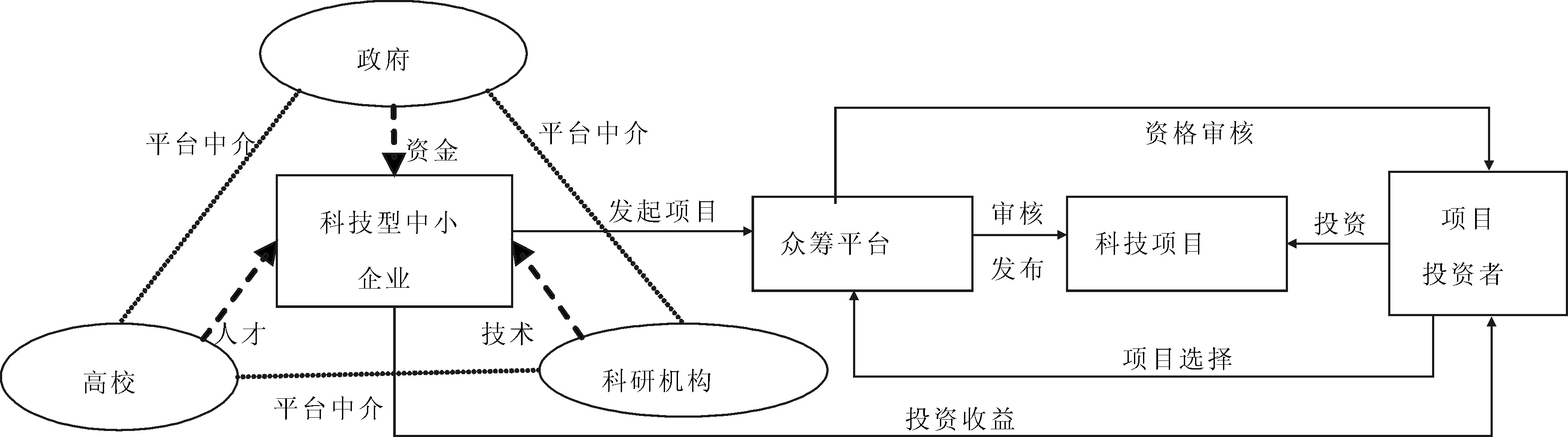 科技型中小企业不仅存在融资困难,而且缺乏研发技术资源和管理资源,这对企业发展造成很大限制;而高校、科研机构人才储备较多,研发资源丰富,高校科研成果转化率相对较低;众筹平台具有中介功能,这有利于资源整合,促进科技型中小企业与高校或科研机构合作,以互相弥补不足,实现资源共享;政府应该大力引导与扶持互联网科技众筹发展,推进政产学研合作。通过众筹平台中介连接,科技型中小企业与高校或科研机构、政府间建立起联动合作机制,一方面,可为科技型中小企业提供资金、技术、人力资源支持,提高互联网科技众筹融资成功率和企业经营能力,进而提高平台知名度;另一方面,也有助于促进高校、科研机构等开展科研成果转化,充分发挥各方优势,促进互联网科技众筹及我国科技创新创业发展,如图5所示。