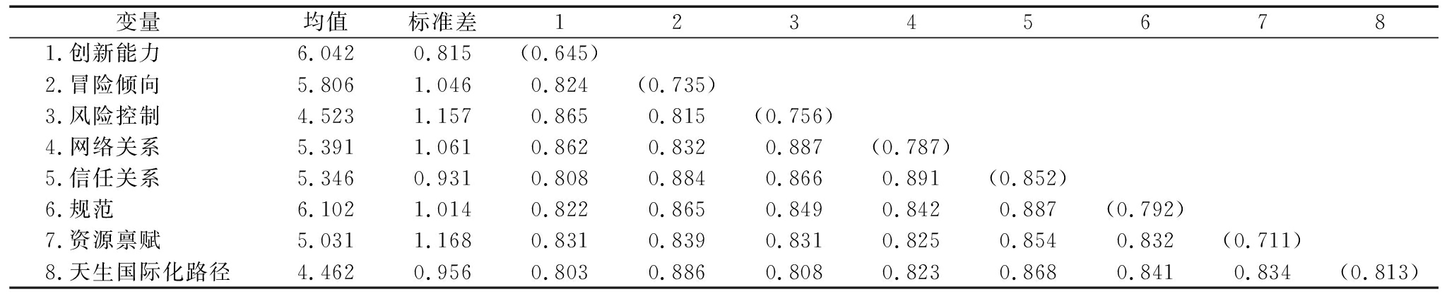 运用SPSS22.00软件对各量表信度进行检验,其中,企业家创新能力、冒险倾向性及风险控制能力、网络关系、规范与信任及天生国际化路径选择的内部一致性系数分别为0.829、0.910、0.915、0.932、0.937、0.912、0.910,均大于0.8,表明量表信度较高。从效度来讲,本研究借鉴了国内外的成熟量表,因此具有较好内容效度。此外,每个变量的AVE值均大于0.5,其平方根均大于该变量与其它变量的相关系数,表明研究模型具有良好收敛效度与区别效度。