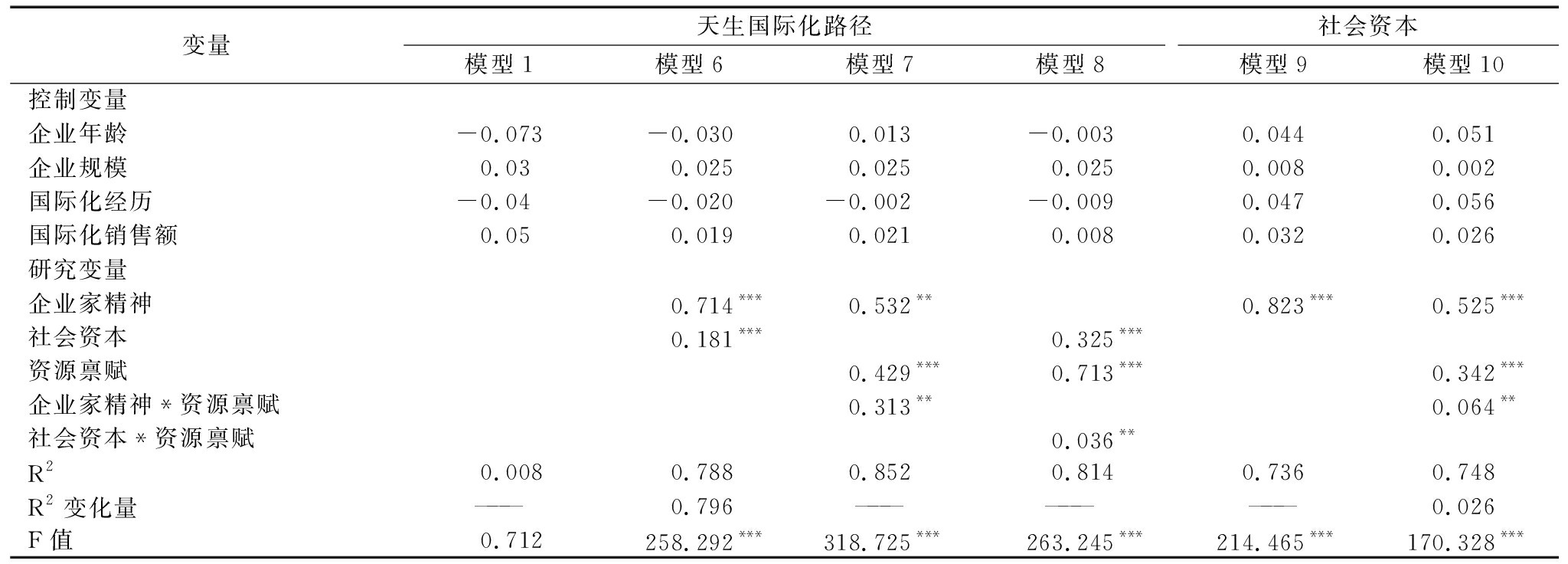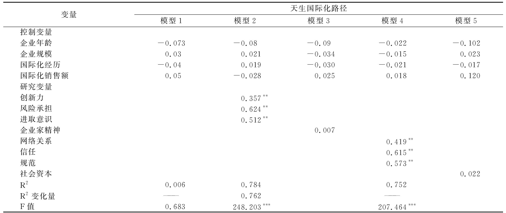 表3企业家精神与社会资本对天生国际化成长路径的回归分析结果