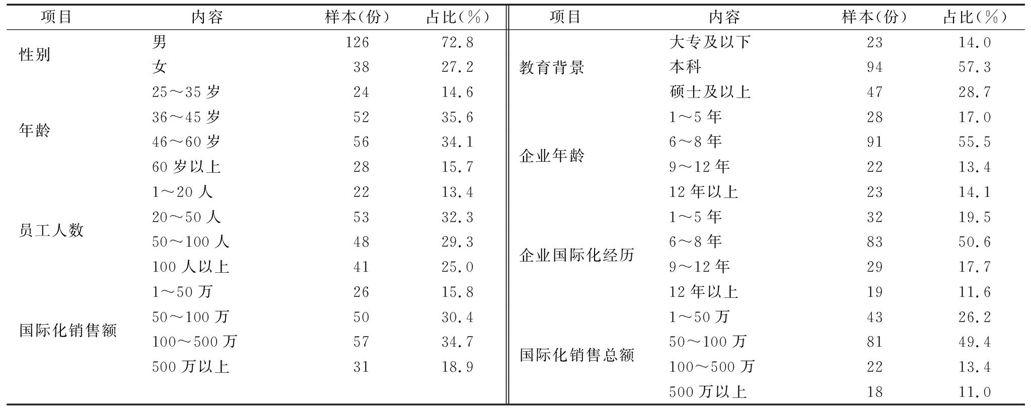 研究共发放调查问卷320份,回收215份,回收率为67%。根据天生国际化企业的4个基本特征,进一步筛选样本,最终获得有效问卷164份。由于被调查者大多具有丰富管理经验和较高学历,对问卷涉及的问题均有较好理解,因此问卷整体质量比较可靠。样本总体情况如表1所示。可以看出,男性居多,占72.8%;年龄段主要集中在36岁及以上,其中36-45岁占35.6%,46-60岁占34.1%;本科学历占57.3%,硕士及以上学历占28.6%。
