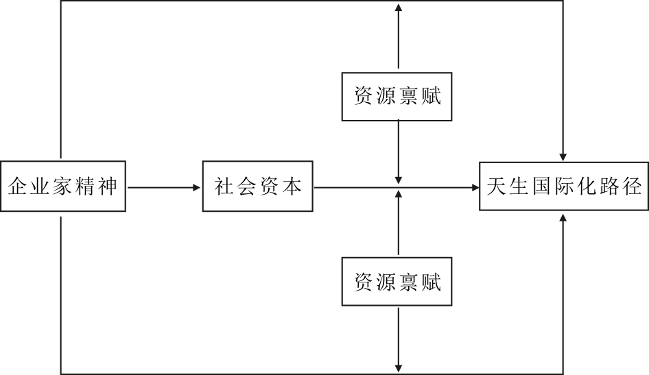 自党的十八大以来,越来越多的科技型中小企业在创新驱动战略引领下,逐步构建了以企业为主体、市场为导向、产学研深度融合的创新体系,并选择天生国际化路径主动进入国际市场。影响科技型中小企业选择天生国际化路径的因素是多方面的,已有研究主要基于资源基础、关系网络、组织行为、知识学习等理论,较多探讨外部环境变量与科技型中小企业行为模式选择的关联性,而对于企业家、组织、创新、企业文化等内部环境变量与中小企业天生国际化路径选择关系的探讨明显不足[6]。事实上,企业家作为组织战略的制定者与实施者,是企业技术创新的源动力,也是企业国际化发展的根本保证,对企业内外部生产要素的优化组合起到至关重要的作用[7]。不同于传统企业,科技型中小企业往往具有知识与资本密集度高、创新能力强、成长快等特征,企业家个人特质及其拥有的社会资本对其国际化路径选择影响显著[8]。研究表明,具有较多企业家精神与社会资本的管理者更倾向于选择快速国际化路径(即天生国际化路径)实现市场扩张目标,而企业家精神与社会资本相对匮乏的管理者则更倾向于选择渐进式国际化路径[9]。基于此,本文构建企业家精神、社会资本与科技型中小企业天生国际化路径关系的概念模型,通过实证,检验企业家精神、社会资本及两者交互作用对科技型中小企业天生国际化路径的影响机制,以优化企业国际化路径模式,提高企业国际竞争优势,提升其国际化绩效。
