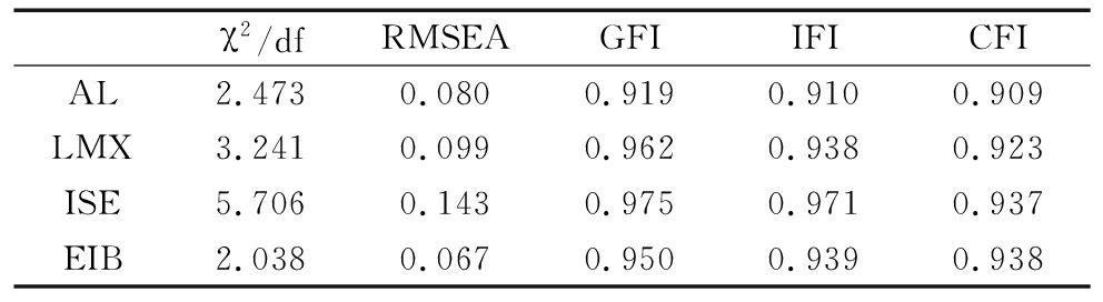 注:四因子模型(AL、LMX、ISE、EIB)、三因子模型(AL、LMX+ISE、EIB)、二因子模型(AL+LMX+ISE、EIB)、单因子模型(AL+LMX+ISE+EIB)