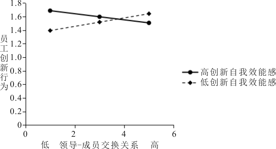 (3)创新自我效能感的调节作用检验。对变量数据进行中心化处理后,由员工创新行为对领导-成员交换、创新自我效能感及其交互项进行回归分析,可得交互项系数为-0.110(M5,p<0.01),因此假设H5得到支持。为进一步说明创新自我效能感的调节作用,绘制调节效应图,如图2所示。结果显示,低创新自我效能感的员工在面对低领导-成员交换关系时,创新行为明显减少,相应地,领导-成员交换关系正向影响员工创新行为的回归系数为0.062。相对于低创新自我效能感的员工,具有较高创新自我效能感的员工在面对低质量领导成员交换关系时,其仍能够自觉产生较多创新行为,且相应的领导-成员交换关系对员工创新行为的影响回归系数为-0.045。以上结果表明,当员工具有较高创新自我效能感时,低质量领导-成员交换关系对员工创新行为的正向影响逐渐减弱甚至转为负向影响,也就是说员工创新自我效能感能够反向调节领导-成员交换与员工创新行为关系。由此,假设H5再次得到验证。