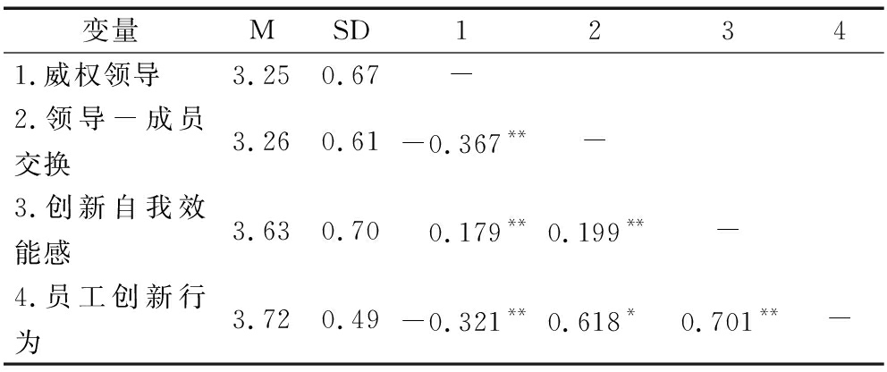 本研究涉及的各变量描述性统计及相关分析结果如表3所示。结果显示,威权领导与员工创新行为显著负相关(r=-0.321;p<0.01);威权领导与领导-成员交换关系也显著负相关(r=-0.367;p<0.01);领导-成员交换关系与员工创新行为显著正相关(r=0.701;p<0.01)。
