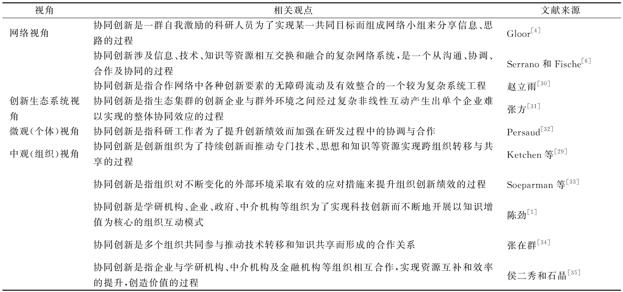 国内外学者对协同创新给予不同的解读,如表1所示。现有研究主要从网络视角、创新生态系统视角、个体视角和组织视角对协同创新进行内涵定义,并提出各自的观点与见解。例如,Ketchen等[29]基于组织视角,将协同创新界定为“创新组织为了持续创新而推动专门技术、思想和知识等资源跨组织转移与共享的过程”。我国学者陈劲[5]从组织视角出发,将协同创新界定为“学研机构、企业、政府、中介机构等组织以知识增值为核心,为了实现科技创新而呈现出的组织互动模式”。