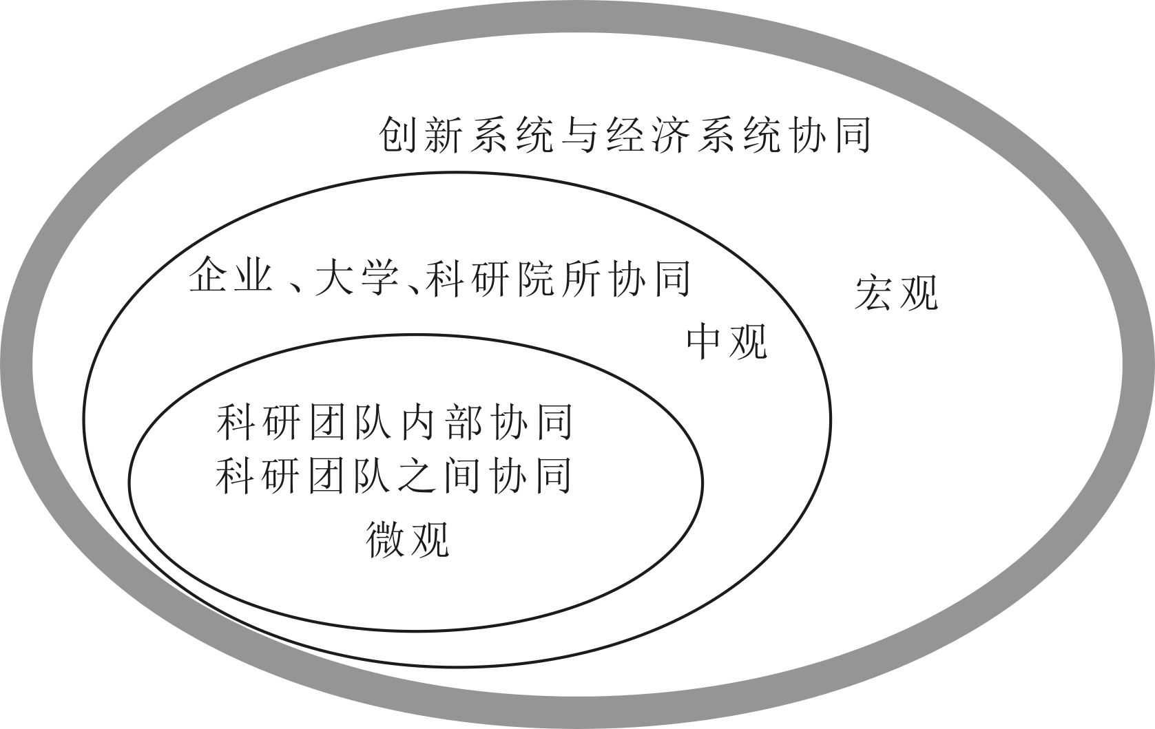 鉴于此,本文充分考虑我国协同创新实践中的问题,借鉴现有研究成果,试图对协同创新内涵提出新见解。依照德国学者Haken提出的“协同学”思想,协同创新并不是简单的拼凑合作,而是一个系统工程,要求系统内各要素和子系统之间相互配合,进而获得超越各部分原有功能总和的新功效[28]。宏观层面的协同创新状况是微观层面诸多主体、要素之间相互协调的综合体现,即微观层次的协同会对宏观层面的协同产生影响。因此,有必要从多层次视角理解协同创新的内涵,本文将从微观、中观及宏观3个层次对协同创新内涵进行界定与理解,如图1所示。微观层面的协同创新是指创新组织科研团队内部及相互之间形成的知识(技术、思想、专业技能)共享机制,通过多方位交流与多样化协作以应对“大科学”时代带来的挑战[36];中观层面的协同创新是指企业、大学、科研院所3个基本创新主体发挥各自资源优势与创新能力,在政府、科技服务中介机构、金融机构等相关主体支持下,实现“1+1+1>3”的协同效应的过程[37];宏观层面的协同创新是指,知识创新体系与经济体系之间有效结合与互动,促使科技、教育与经济融合发展。其实,微观层次的协同创新是构筑协同创新系统的基础和基本单元;中观层次的协同创新,即是以企业为主导的技术创新系统和以大学、科研机构为主导的知识创新系统间的有效协同,是协同创新效应得以实现的重要途径和手段;宏观层次的协同创新,即是国家创新系统与经济系统紧密结合,旨在解决科技、经济“两张皮”的问题,是协同创新追求的终极目标。
