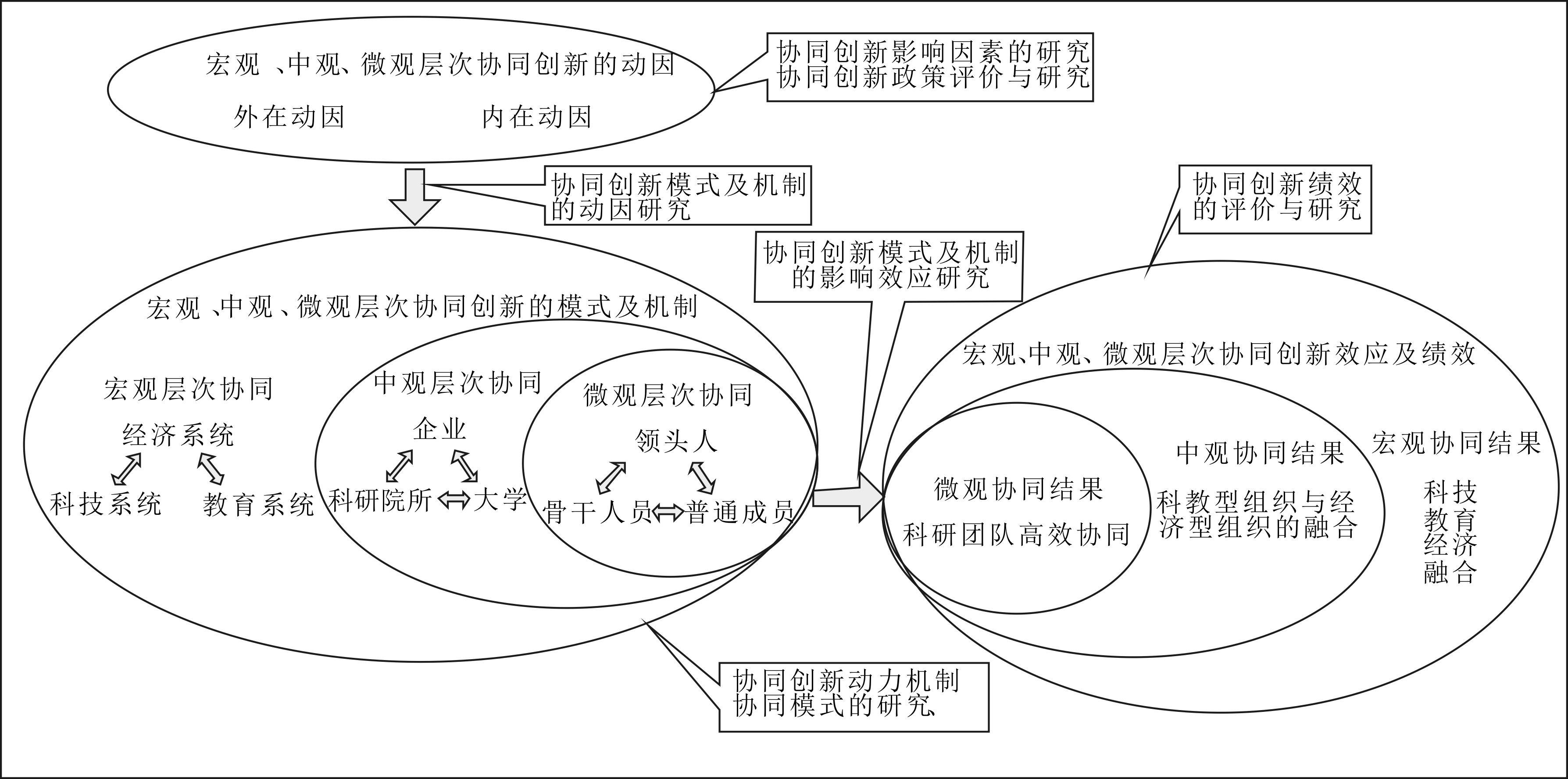 如上文所述,对协同创新内涵的理解,既需要从学术角度阐释,更需要结合政府决策者提出协同创新理念的现实背景加以理解我国提出协同创新的目的在于,通过协同创新打破组织、学科、机制、体制的樊篱,突破部门、行业、区域甚至国别的界限,最大程度地集成和汇聚人才、知识、信息、设备、资金等创新资源与要素,优化科技、教育与产业等系统内外部资源配置,实现知识创新主体(学研机构)与技术创新主体(企业)有效对接,从根本上解决目前我国科技、经济“两张皮”的问题。