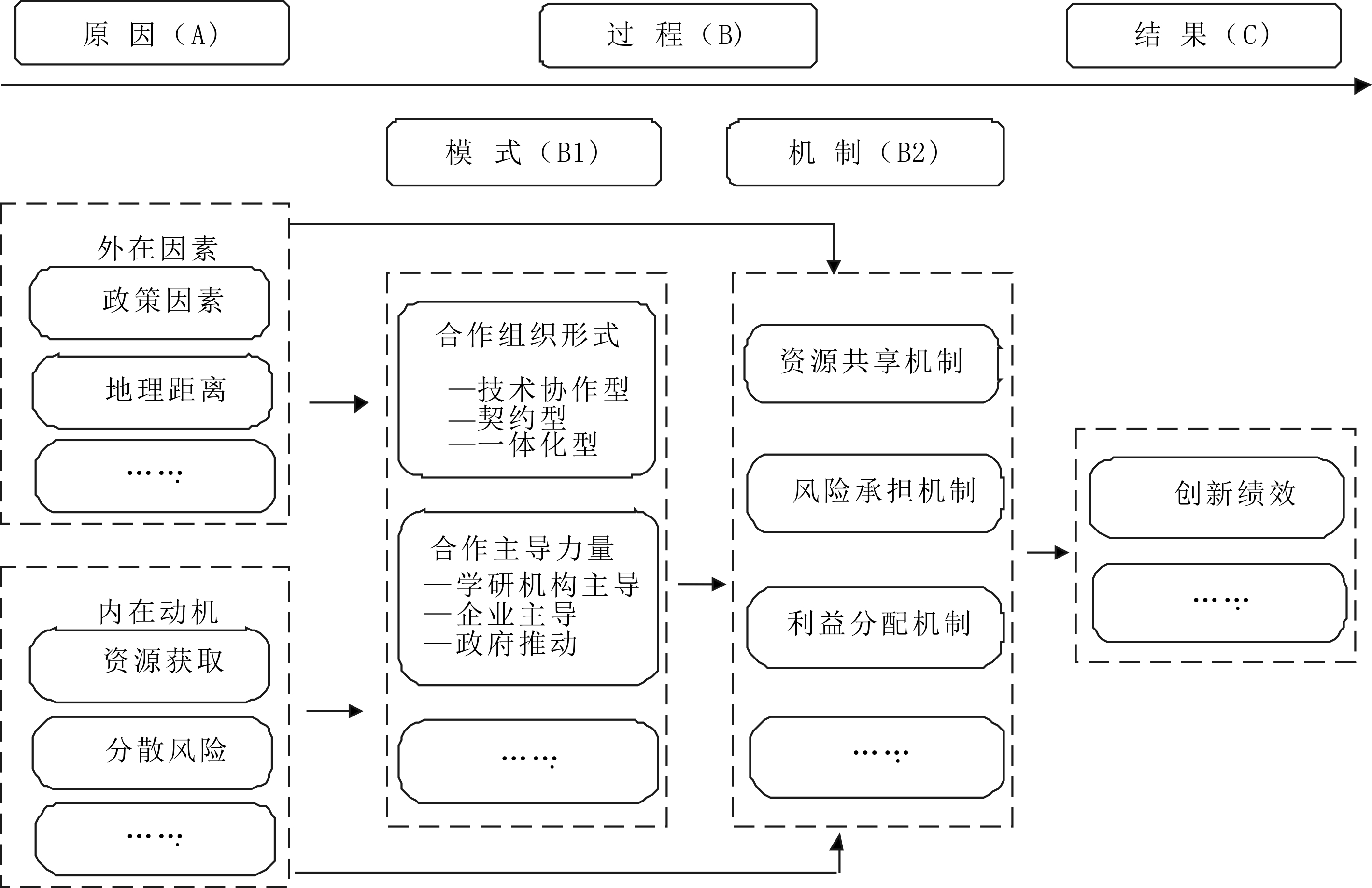 本文借鉴现有研究[38],基于“前因后果”的逻辑思路对协同创新的原因、过程和结果间关系进行分析,构建协同创新分析框架,如图5所示。