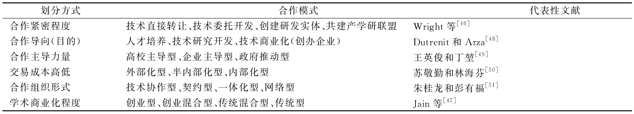 协同创新模式是指,创新主体在创新实践过程中形成的创新行为特点。现有研究基于不同分类标准对协同创新组织模式进行了划分,分类标准包括合作紧密程度、合作导向、合作主导力量、合作组织方式、交易成本等,如表2所示。例如,Wright等[46]按照合作强弱程度,将协同创新类型划分为技术商业化、专利许可、联合攻关、技术咨询及人才流动;Jain等[47]按照商业化程度高低,将产学研协同创新划分成为4类,分别为创业型、创业混合型、传统混合型、传统型。还有一些研究依照合作组织形式将产学研协同创新模式划分为技术协作型、契约型、一体化型、网络型。总体上,现有研究主要基于中观(组织)视角对协同创新模式进行了研究,聚焦于产学研协同创新模式,而基于宏观或微观视角的协同创新模式研究相对较少。