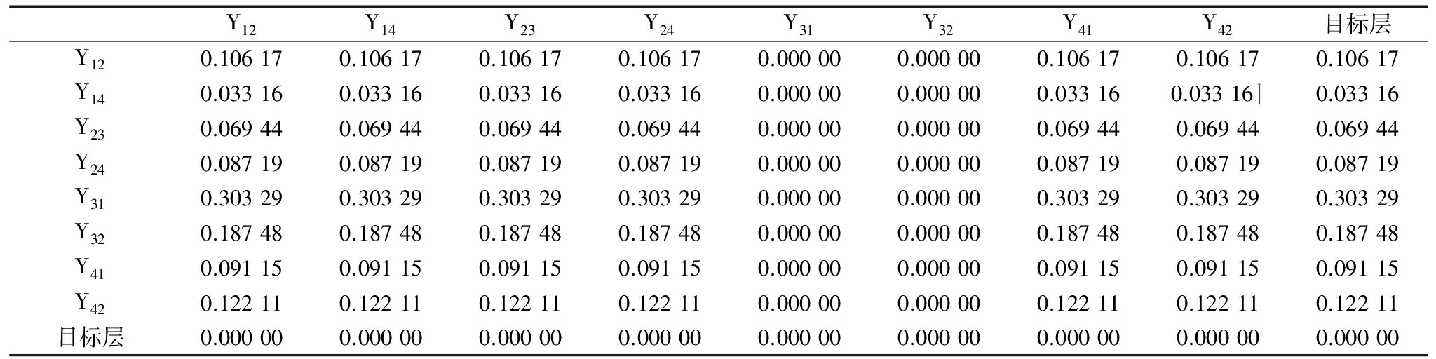(2)指标权重求解。常规方法中,由于指标赋权时缺少对各子系统众创网络协同度的比较判断,且序参量的交互比较意义并未凸显,因此耦合系数并不能完全反映子系统的协同需求。鉴于此,借助ANP方法可实现对复杂网络关系的解析测度。通过梳理多团队非正式众创网络界面间的作用关系,构造出用于ANP分析的网络结构。依据Saaty教授(2005)提出的常规ANP判断矩阵构造方法,遵循序惯式全局判定思路,将具有相互作用关联的准则层界面、网络层界面进行相对于上一层评价需求的两两相对重要性比较,形成界面间协同度判断矩阵。设界面系统整体协同水平的评价目标为G,不同准则层的界面评价维度为XA(A=1,2,3,4),网络层中的具体评价界面集合为Y={Yj}(j=1,2,3,...,20)。在求解矩阵并经归一化处理后可得到相应准则层对其它准则层的影响权重列向量ωxj及其加权矩阵M。同理,继续构建准则层和网络层内部界面影响矩阵,得到反映所有界面相对权重的初始超矩阵W。W与M分块相乘之后可得到列归一化的加权超矩阵