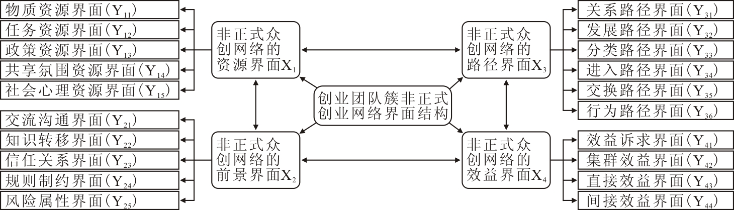 非正式众创网络的路径界面主要包含关系路径、发展路径、分类路径、进入路径、交换路径和行为路径等可能影响团队合作方式搜寻与转换的导向性决策要素关联。关系路径界面(Y31)是指由非正式关系中如亲缘关系、地缘关系等先天关系和共同兴趣、创业合作交往活动等后天关系形成的关系演进历程关联[10]。发展路径界面(Y32)是指在创意产生阶段激发创意、创新实施阶段寻找合作伙伴和创新扩散阶段拓宽空间等不同创业阶段形成的主要职能演进历程关联[11]。分类路径界面(Y33)是指由非正式众创网络内外主体不同合作倾向形成的层次化网络关联,其中,内部主体分类路径主要反映各职能部门与创新活动之间形成的层次化网络关联[12],外部主体主要反映具有合作关系的高校、科研院所、供应商、客户、政府以及其它外部机构和个体间形成的层次化网络关联[13]。进入路径界面(Y34)是指非正式众创网络不具有生产环节中所需的全部能力,选择符合个人意愿的环节通过跨越机构、组织障碍和正式合作界限,伸展到其它机构和组织所形成的跨网络关联。交换路径界面(Y35)是指由关系形式、发展层次、内外部统筹需求及进入倾向等形成人工设计的方便非正式主体间交互、转换的关联。行为路径界面(Y36)是指由动态合作角色与功能选择形成行为者之间的非正式活动等潜在影响的多维度行为效用关联。