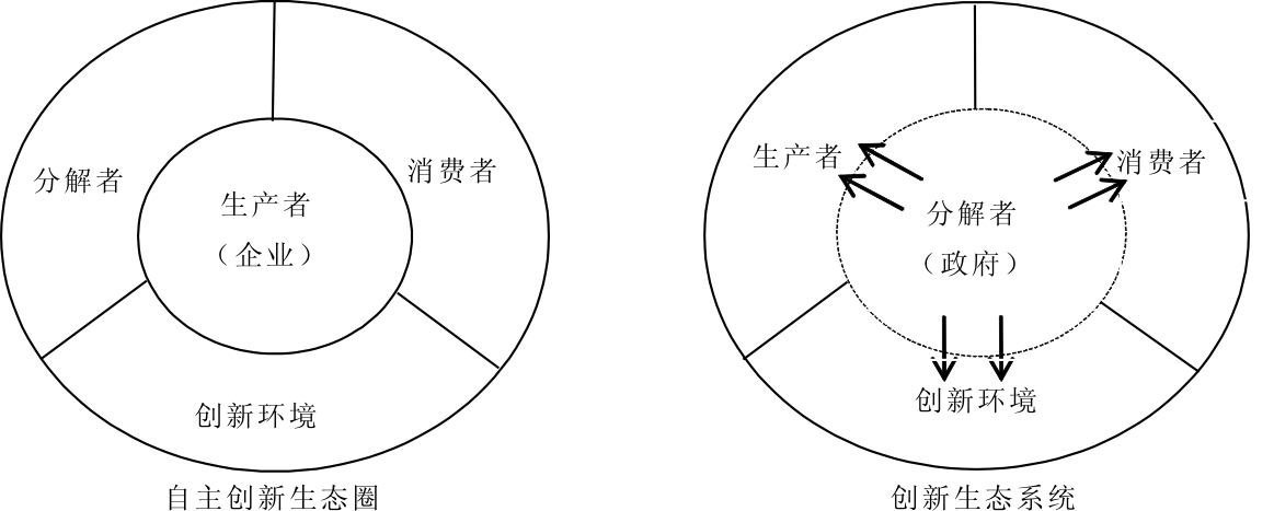 自主创新生态圈是将生物学理论引入创新范畴而形成的一种动态多层次、有机开放的生态学创新理论结构。自主创新生态圈与创新生态系统不同(见图1),自主创新生态圈是以企业、科研机构等生产者为中心,强调生产者的主导性,而创新生态系统更注重政府(分解者)在营造创新环境中的作用[10]。与一般的创新生态圈不同,自主创新生态圈更重视企业、科研机构等创新主体的主动权以及对创新成果的所有权[11]。
