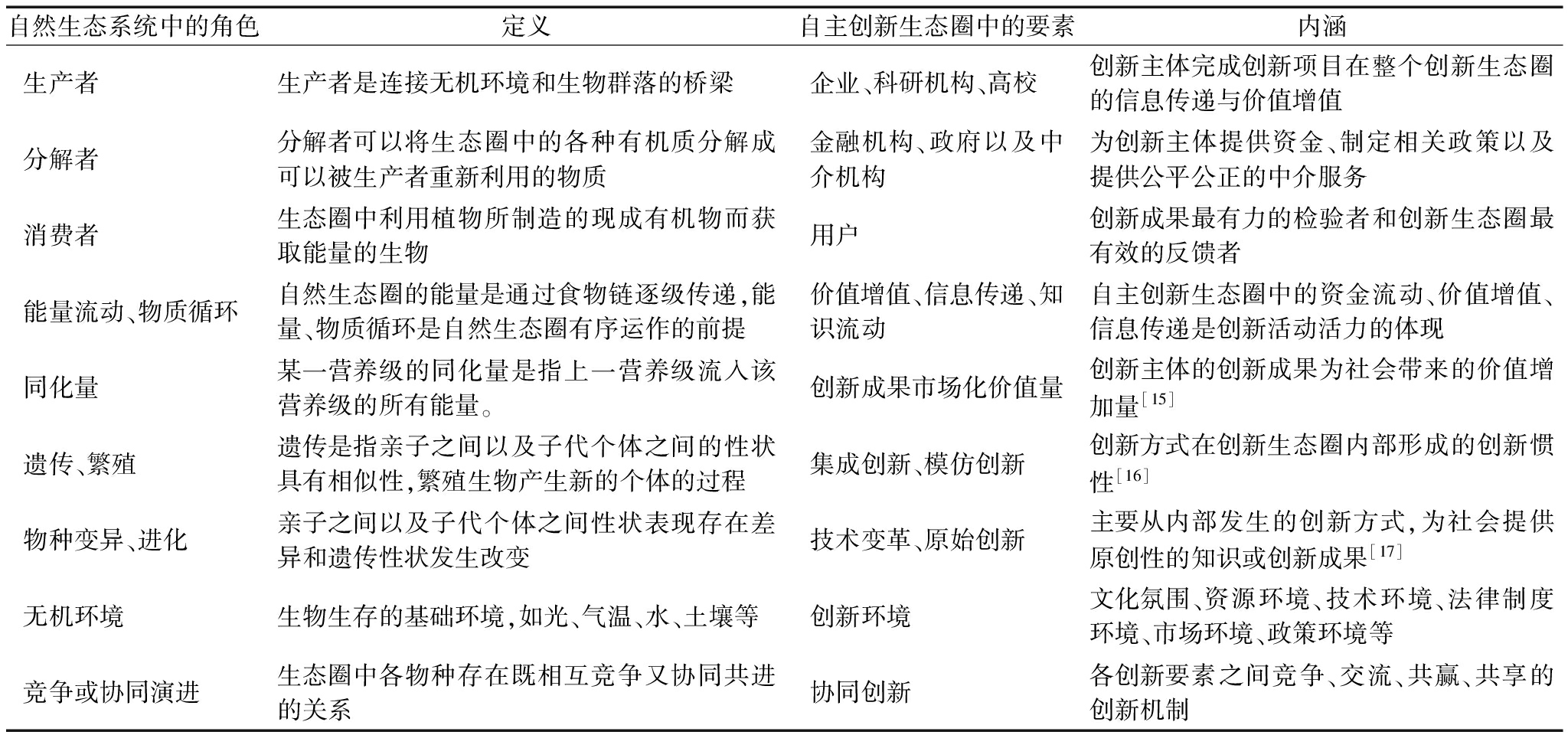 表1自然生态系统与自主创新生态圈要素对比