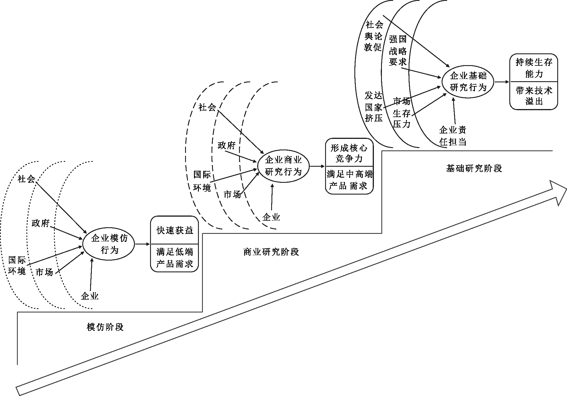 (4)从阶段演进看,在模仿阶段,企业价值体现在快速生存发展上,社会价值体现在满足低端产品需求上;在商业研究阶段,企业专注于形成核心竞争力和满足中高端产品需求;在基础研究阶段,企业价值和社会价值再次发生变化,变为形成持续生存能力和为社会带来技术溢出。