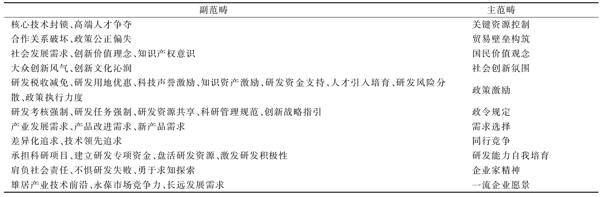 轴心式编码过程是将开放式编码中被分割的资料加以类聚,主要发现和寻找范畴之间的逻辑关联[15]。本文通过对副范畴含义的深入理解和其间逻辑关系的查找,最终得到从副范畴到主范畴的两条归并路径。第一条路径是根据条件-行动/互动-结果的编码范式对副范畴进行整合得到主范畴。例如,副范畴中雄居产业技术前沿、永葆市场竞争力、长远发展需求之间存在以下逻辑关系——雄居产业技术前沿→永葆市场竞争力→长远发展需求→一流企业愿景。因此,这几个副范畴可整合为主范畴“一流企业愿景”。第二条路径是把多个副范畴合并进一步归纳得出主范畴,例如,研发考核强制、研发任务强制、研发资源共享、科研管理规范、创新战略指引可整合为主范畴“政令规定”。轴心式编码结果如表2所示。