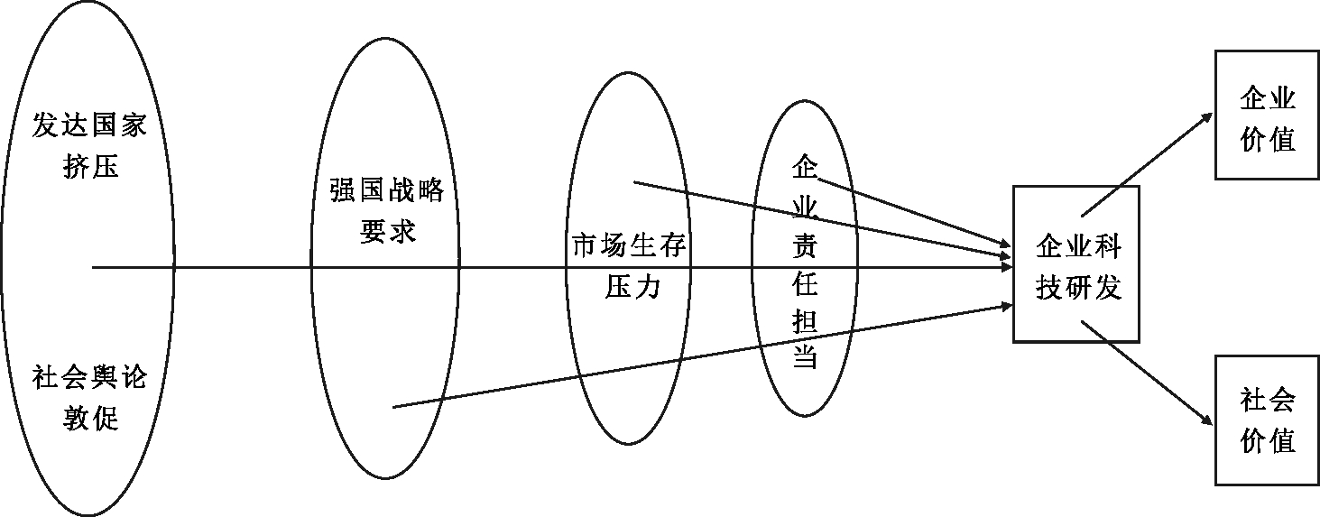 (2)发达国家挤压主要包括发达国家对关键资源的控制和贸易壁垒的构筑;社会舆论敦促主要包括国民价值观念教化和社会创新氛围熏陶;强国战略要求主要分为政策激励诱导和政令规定强制;市场生存压力主要体现为需求选择压力和同行竞争压力;企业责任担当主要包括企业家精神指引、一流企业愿景追求和企业研发能力自我培育。
