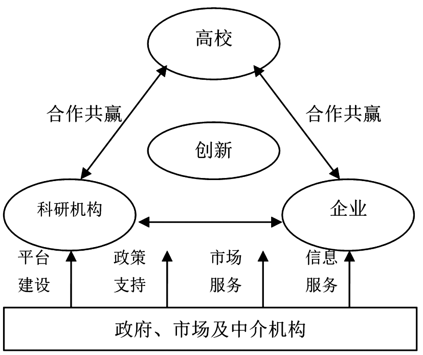 产学研合作创新是以企业、高等院校和科研机构间的合作为基础,按照特定规则重新组合,实现彼此资源相互协调的合作模式。产学研合作的最终目标是更好地实现科技成果转化、提升自主创新能力,实现多方“合作共赢”和利益最大化。企业参与产学研合作的最终目的是通过技术升级获得新的利润空间,实现产业核心竞争力提升;高校、科研机构等参与合作是为了实现稳定、良好的资金链循环,推动知识成果市场化与商业化。企业、高校和科研院所之间紧密合作,不仅能充分发挥各方优势、弥补研发短板,而且能对资源进行优化配置。另外,政府、市场与中介机构等主体构成的支撑体系在合作创新中的作用多表现在平台建设、政策支持、信息服务和综合服务等方面[22]。