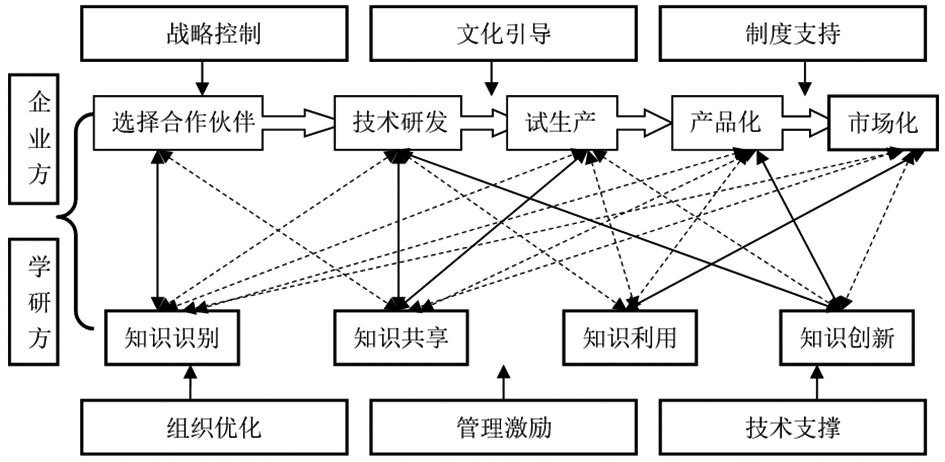 对于产学研合作创新过程中的知识管理环节,彼此之间是顺序连接和循环往复的关系,遵循螺旋上升的知识链和协同创新发展路径。对原理与技术知识的巨大需求促使企业向外部学研机构搜寻知识源,达成合作契约后学研机构向企业进行知识转移与共享,企业通过知识消化、吸收与整合,实现知识再创新,最终将技术理论知识应用于生产与市场实践。
