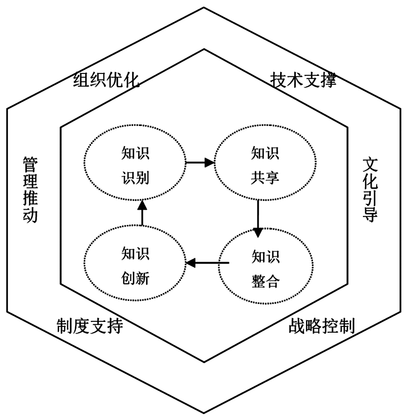 知识管理是一个系统管理过程,并不是各个环节的简单叠加。知识管理过程由核心流程和外部支撑因素共同构成。其中,核心流程包括知识识别、获取、传递、共享、整合、保存、利用和创新等;外部支撑因素包括战略因素、组织因素、文化因素、技术因素、制度因素和管理因素等(如图2)。