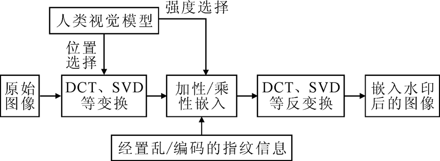 数字水印是一种嵌入认证信息的概念,能提供一种有效的可见或不可见的标记信息,在不影响原载体使用价值的前提下,直接嵌入数字载体(包括多媒体、文档、软件等)中或通过修改特定区域结构间接表示。通常来说,不易被探知和再次修改,但在数字载体传输前后都能有效地被生产方识别并提取,这是提高信息安全性,实现内容认证、防伪溯源、版权保护的有效办法[3]。图1为数字水印系统应用流程,系统包含两个部分,即水印嵌入及水印提取[4]。