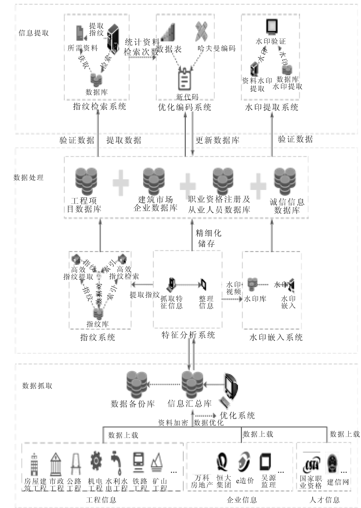 (2)数据处理由3个系统组成,包括指纹系统、水印嵌入系统及特征分析系统。在指纹系统中,对原数据或数据载体文件进行指纹提取操作,得到每项数据的唯一指纹编码并与位置索引组成数据对,以实现数据快捷获取;水印嵌入系统。将水印并嵌入数据有助于数据验证,并且能对篡改与盗取数据的非法分子进行追踪。该系统是水印提取系统的基础;在特征分析系统中,对数据进行编码,提取编码特征并分类储存,如工程项目数据库、建筑市场企业数据、职业资格注册及从业人员数据库、诚信信息数据库等,精确分类有助于数据查找。