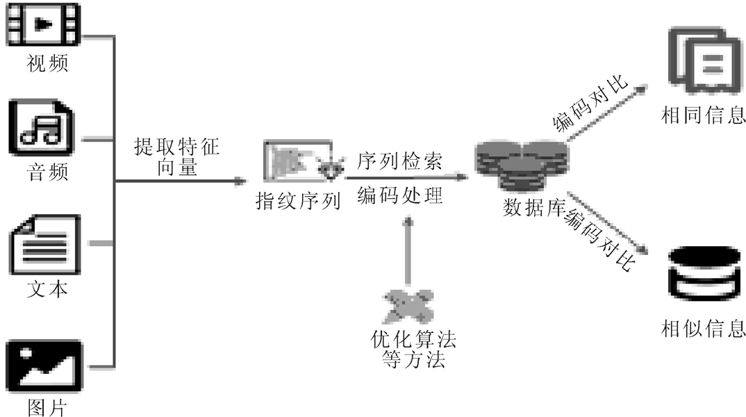 数据处理核心技术包括3个系统,即指纹系统、水印嵌入系统及特征分析系统。近年来,针对真伪鉴别、所有权验证及监控等,国内外对指纹水印的研究日益深入。指纹系统的核心技术是指纹提取及后期指纹检索等,在获得数据后,提取待处理数据的特征向量,并按一定规则形成简短、唯一的指纹序列(见图3)。有学者提出,可通过提取视频的抽象特征形成指纹信息[7-8],但是该方法区分性较弱,因为抽象特征与原数据只是相似关系。余旺盛等[9-10]提出提取全部特征的指纹算法,该方法虽然能保持较好的攻击高鲁棒性,但是难以检测数据微小篡改。此后,多种指纹提取方法被提出,如利用局部特征提取指纹、基于兴趣点特征提取指纹信息,以及结合空域特征和时域特征生成指纹等。