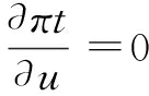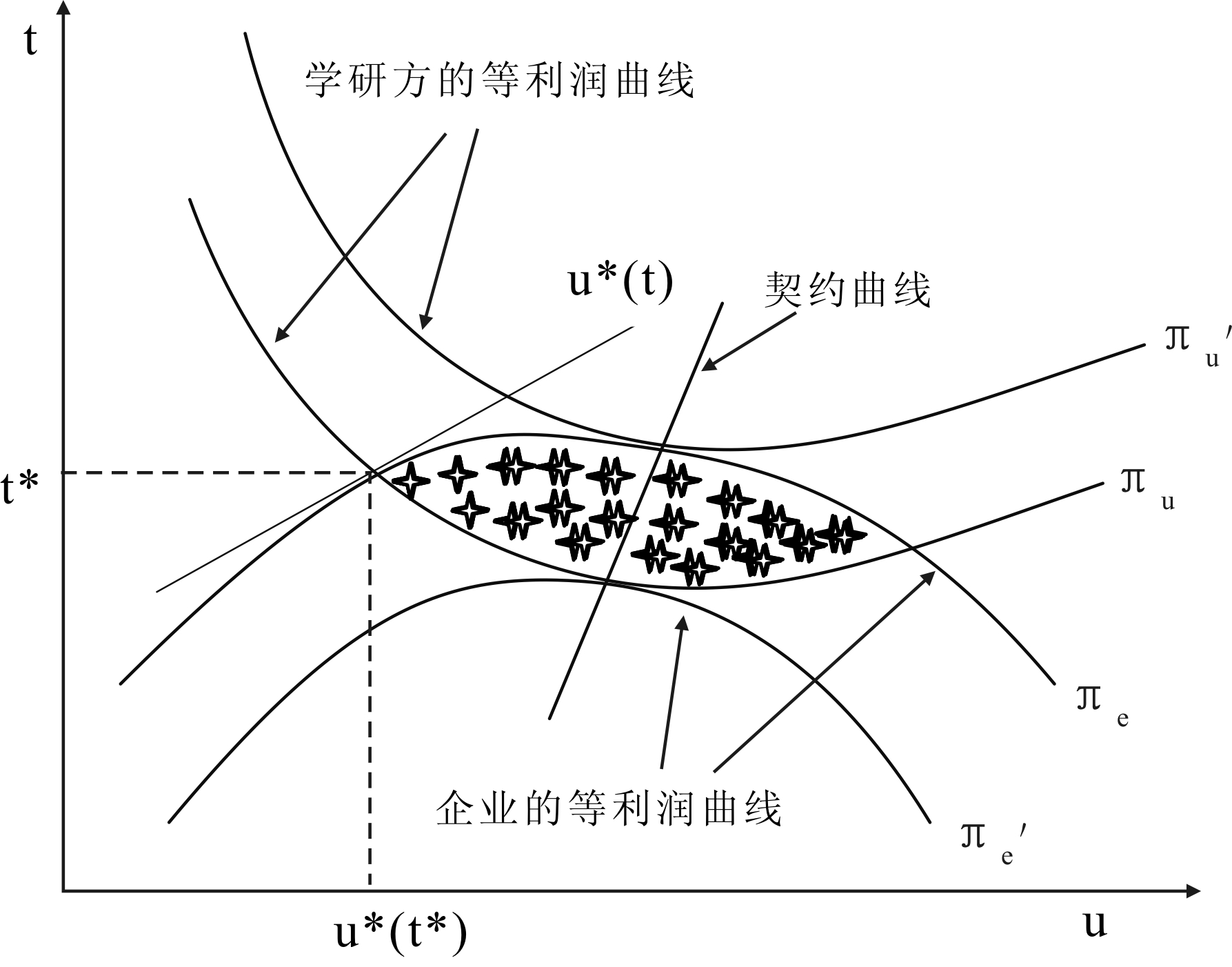 虽然(t*,u*(t))是一个子博弈精炼纳什均衡结果,但由图1可以看出,该点并不是帕累托最优点,因为该点企业方与学研方的等利润曲线是相交而不是相切。如果t和u在双方利润曲线围成的阴影区间内,双方的利润都可以获得增加(企业方较低的等利润曲线代表较高的利润水平,而学研方较高的等利润曲线代表较低的利润水平)。从图1还可以看出,帕累托最优契约必须在契约曲线上,其满足以下条件: