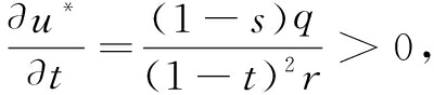 由式(4)知学研方的创新程度u*是企业方成本分摊比例t的函数,且有