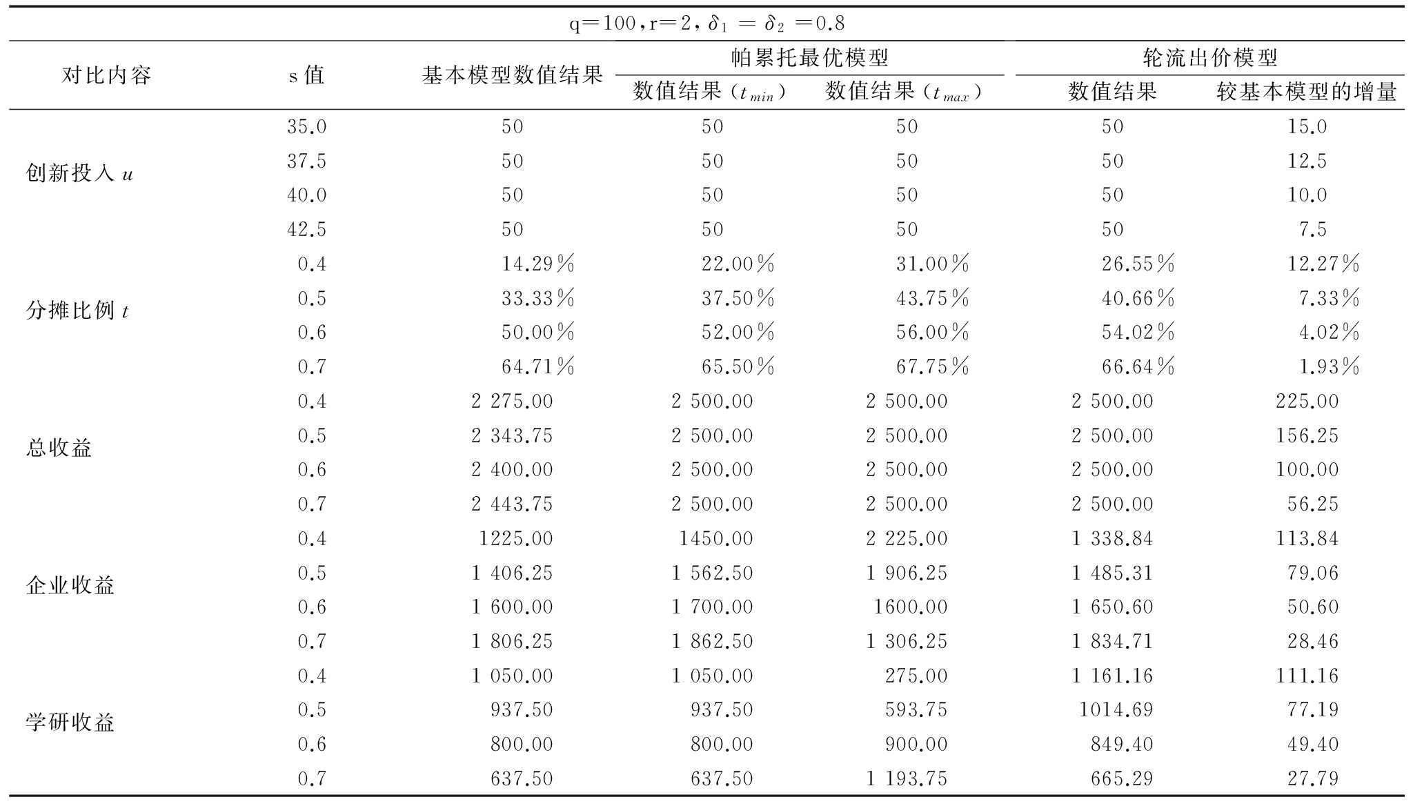 表2验证了本文结论,即轮流出价模型在创新投入及总收益上都达到帕累托最优模型水平,无论是企业方收益还是学研方收益都较之于基本模型获得了明显提升,双方也具有成本分摊合作的积极性,进一步证明了其现实可行性。