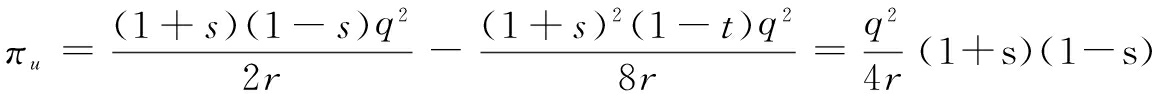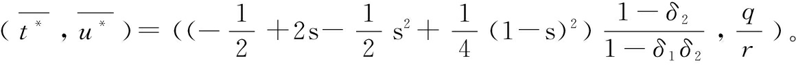 根据企业方和学研方的理性人假设,双方均以自身收益最大化为决策原则。在协同创新过程中,双方事先以契约方式约定,将技术创新的收益以(s,1-s)的比例进行分配。此时,双方博弈将分成两个阶段:第一阶段,企业方向学研方承诺分摊比例为t 的技术创新成本;第二阶段,学研方选择使自身收益最大化的创新程度u。在本研究中,采用逆向归纳法对博弈模型求解。